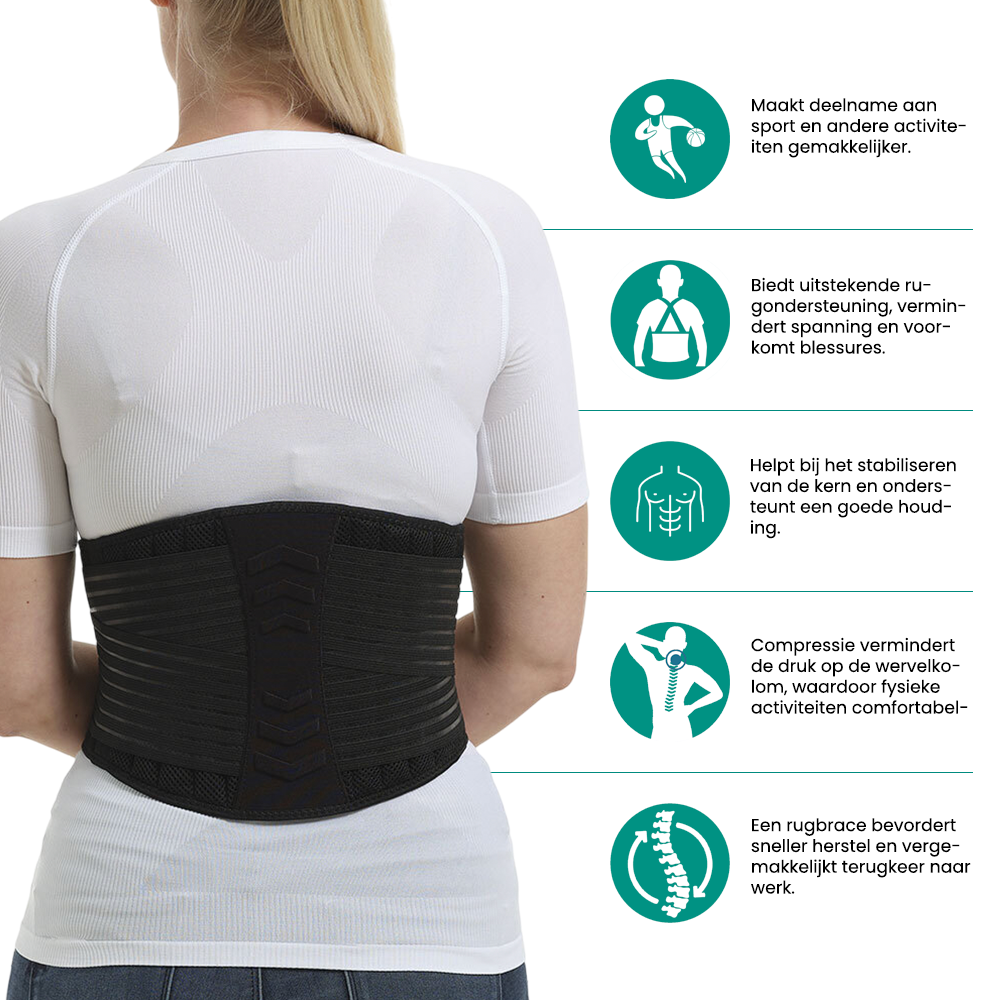 Steunende Rugbrace voor het stabiliseren en verlichten van de onderrug. De Rugbrace helpt de natuurlijke ingezakte lichaamshouding, die vaak ontstaat bij rugklachten, tegen te gaan. Probeer het met 30 dagen retourrecht! Lees meer